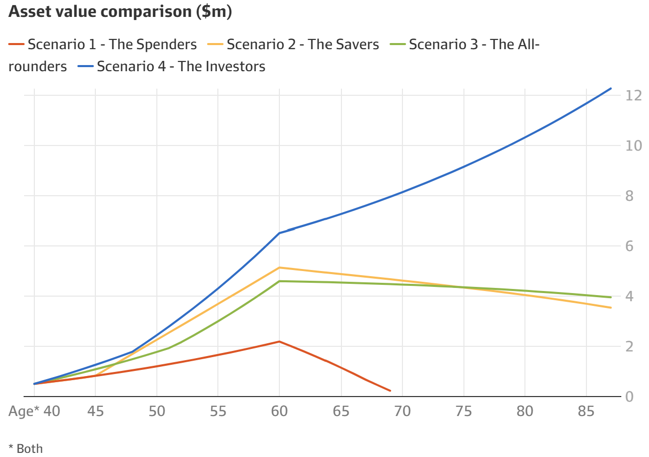 The chart compares four hypothetical couples, all aged 40, earning a combined $600,000 per year and planning to retire at age 60. Each couple starts with similar assets, similar homes, similar debt, and similar superannuation balances. What differs is how they approach spending, saving, and investing.